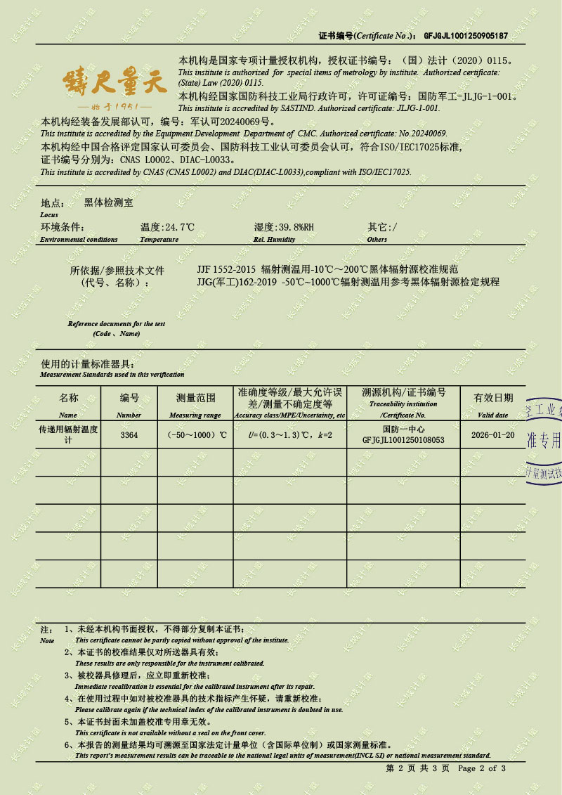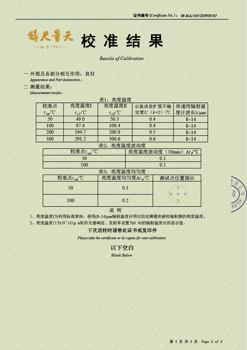 | 上一條:黑體輻射源(50-500℃)校準(zhǔn)證書(shū) | 下一條:溫濕度檢定箱校準(zhǔn)證書(shū) |